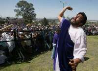 Finalmente, Jesús y los dos ladrones llegaro al cerro donde serían crucificados. Las cruces, hace unos días se supo, estaban encima de una pirámide prehispánica.