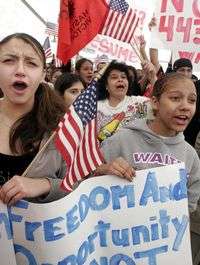 Ampliar la imagen Angélica López de 16 años, y Courtney Monroe, de 14, marchan durante la protesta de migrantes en Toledo, Ohio, el pasado 12 de abril. Según EIU, los niños de 16 a 18 años en los hogares de inmigrantes tienen un nivel de escolaridad más bajo que los de hogares de no inmigrantes Foto: Ap