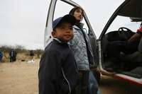 Ampliar la imagen Cerca de la ciudad de El Sásabe, una mujer y su hijo de cinco años piden ayuda a un integrante del grupo Beta, que asiste a migrantes, ya que ella decidió no hacer un segundo intento por cruzar el desierto Foto: Ap