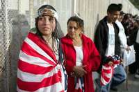 Ampliar la imagen Michelle Torres, de 13 años, de Hollywood Norte, California, se envuelve con una bandera estadunidense durante una protesta de inmigrantes en el bulevar Van Nuys en Los Angeles Foto: Ap