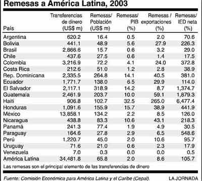 En términos absolutos, el destino de los recursos se concentra en seis países que, en 2003, recibieron casi 78% de las remesas que se enviaron a América Latina: México, Colombia, Brasil, Guatemala, República Dominicana y El Salvador. El 40% de las remesas totales de la región llegaron a México. También en 2003, la remesas excedieron 26% a la inversión extranjera directa (IED) y representaron 2% del PIB de la región y 8.6% de las exportaciones. En las pequeñas economías centroamericanas las remesas representaron un porcentaje mayor del PIB.