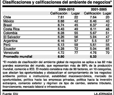 Las recientes clasificaciones del ambiente global de negocios de EIU, llevadas a cabo a fines de marzo pasado, muestran que las calificaciones de todos los países latinoamericanos estudiados tienden a deteriorarse. Aunque EIU no prevé que el desencanto generado por las reformas liberales en la región se traduzca en un rechazo en gran escala contra los capitalistas foráneos, el entusiasmo por la inversión extranjera podría ser más reservado que en el pasado. Durante el periodo 2006-2010, todos los países bajarán en la clasificación de ambiente de negocios. La competitividad es un problema creciente en muchas economías y las naciones de la región enfrentan condiciones políticas difíciles, que no serán favorables a una reforma.