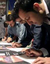 Iraníes firman papeles en los que indican que están preparados para el martirio o para efectuar ataques suidas contra Israel, ayer en lo que fue la embajada de Estados Unidos en Irán