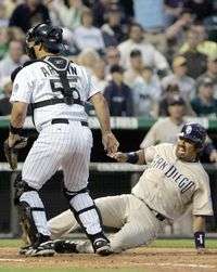 Vinicio Castilla, de los Padres de San Diego, impulsa una carrera más en la victoria de su equipo 5-2 sobre Colorado, ante la impotencia de Ben Johnson y Danny Ardoin (55)