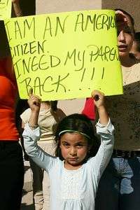 Una niña despliega una pancarta durante una manifestación contra la iniciativa Sensenbrenner afuera del edificio del ayuntamiento, en Hobbs, Nuevo México