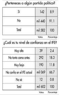HUBO UNA VEZ que el Instituto Federal Electoral (IFE) era la institución de mayor credibilidad del país, o casi. Sin embargo, según los resultados del muestreo de esta semana, el IFE de hoy no es el mismo que el de hace seis años. Su presidente y demás consejeros -dicen- responden a intereses de dos partidos: PAN y PRI. También hay opiniones en sentido opuesto: el IFE es una institución que descansa sobre una gran estructura y no sólo responde a intereses partidistas o personales.