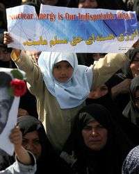 Ampliar la imagen Una niña iraní muestra un cartel con la leyenda "La energía nuclear es nuestro derecho indisputable", durante un viaje reciente del presidente Mahmoud Ahmadinejad a la provincia de Khorasan Rasavi FOTOAp