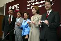 El consejero electoral del IFE, Arturo Sánchez, y los representes de partidos: de Nueva Alianza, Rafael Méndez; del PAN, Josefina Vázquez Mota; del PRI, Rosario Green, y de Alternativa, Luciano Pascoe, después del sorteo para el debate FOTOCristina Rodriguez