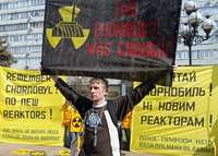 Un ucraniano se manifiesta contra el uso de la energía nuclear en la inauguración, ayer, de un ciclo de conferencias en Kiev sobre la tragedia de Chernobyl
