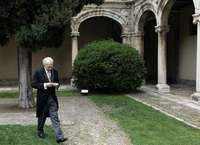 Ampliar la imagen Sergio Pitol camina por el centro de la Universidad de Alcalá de Henares, mientras observa la medalla del Premio Cervantes 2005, que hace unos días recibió de manos del rey Juan Carlos de Borbón, en el paraninfo de ese recinto académico FOTOAp