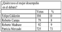 ¿DE VERAS GANO Calderón el mini-debate de antenoche? ¿Se vio así de sobrado al candidato panista? ¿O hay algo atrás de la ensordecedora campaña de medios para hacerlo ver como el laureado triunfador? 725 personas de un millar -mujeres y hombres de toda la República-, cuya opinión sondeamos, dicen que Patricia Mercado, sin haber tenido un desempeño que pudiera llamarse genial, lució mejor que Campa, Calderón y Madrazo.