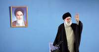 Alí Jamenei saluda a iraníes. Al fondo, la imagen del ayatola Rojula Jomeini, fundador de la república islámica