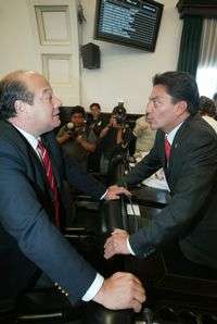 El perredista César Raúl Ojeda dialoga con el priísta Oscar Cantón, durante la sesión de ayer del Senado de la República