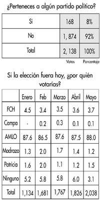 A OCHO SEMANAS del día de la elección parece insalvable la derrota del PRI. Las encuestas de diversas empresas son distintas en sus resultados, excepto en uno: todas colocan a Roberto Madrazo en el tercer lugar. Podría repetirse la derrota del 2 de julio de hace seis años de la organización que sigue siendo la principal fuerza política del país. A contracorriente de los sondeos de opinión de distintos colores y sabores que han menudeado en las semanas recientes, los resultados de nuestra encuesta -la penúltima, correspondiente al mes de mayo: sólo haremos otra en junio- indican que Andrés Manuel López Obrador continúa en primer lugar. En el cuadro aparecen los resultados de los sondeos de enero a la fecha.