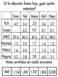 ESTA SECCION SIN lectores -todos somos autores- recibió varios mensajes en el sentido de que el cuadrito que publicó ayer sábado con el resumen de las cinco antiencuestas realizadas de enero a mayo resultaba de difícil lectura. Volvemos a publicarlo. Los encuestados son personas -mujeres y hombres de toda la República- que en su inmensa mayoría dijeron no pertenecer a ningún partido político. La única interpretación posible es que se requeriría de una gigantesca maquinación para quitarle a López Obrador el voto de los electores sin partido, que son los que finalmente decidirán la votación.
