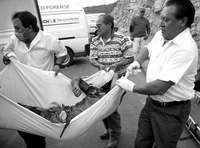 El autobús de la línea Autonaves,con placas de circulación 905-HU9 del servicio público federal, tras el accidente ocurrido a unos 20 kilómetros de la ciudad de Rioverde, San Luis Potosí. A la derecha, identificación y traslado de cadáveres