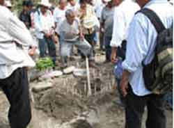Con mucha paciencia los ancianos, dirigidos por el mayor de todos ellos, don Domingo Luna Díaz, destaparon la ofrenda y la fueron colocando en cada uno de los hoyos abiertos en la tierra. Primero en el centro, adonde entregaron la carne preparada de una guajolota y un chorro de champurrado de cacao, para luego colocar cuidadosamente un juego de cruces de ocote en los sitios indicados dentro del orificio. Antes de cerrarlo curaron el sitio con aguardiente de caña. Inmediatamente procedieron a taparlo con su propia tierra y colocaron una piedra grande de río encima.