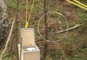 Aproximadamente dos horas después, el helicóptero levantó el vuelo nuevamente con su valiosa carga, para llevarlo hasta "Lachiwechi" (Llano Mazate), pequeño plan sobre el cerro, situado a la orilla de la selva, en donde los propios comuneros, con una serenidad impresionante a pesar de no tener ningún tipo de protección, alzaron la puerta de la jaula y lo pusieron en libertad.