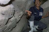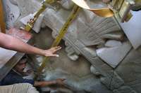 Uno de los trabajadadores señala uno de los relieves de la figura * María Meléndrez Parada