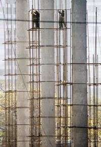 Obreros chinos levantan la estructura de lo que será un complejo residencial y comercial. La demanda de trabajadores en Guangdong es mucho más alta que en cualquier otra parte, e incluso los no especializados pueden tener empleos mejor pagados