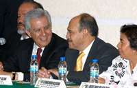 El director general del IMSS, Fernando Flores, y el secretario general del IMSS, Roberto Vega Galina, durante la inauguración de las primeras Jornadas de Enfermería, con motivo del Día Internacional de la Enfermera. Coincidieron en que el instituto y el sindicato tienen un compromiso permanente con la capacitación del personal, especialmente a las enfermeras, para dar servicios de más calidad a los derechohabientes