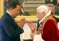 Ciudad del Vaticano, 11 de mayo. El papa Benedicto XVI recibió este jueves al presidente de Venezuela, Hugo Chávez, y le manifestó una serie de preocupaciones sobre amenazas a la libertad religiosa en la extensa comunidad católica venezolana, dijo el Vaticano.