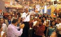 Cárdenas, Tab., 11 de mayo. El mitin que encabezó Felipe Calderón en este municipio, gobernado por el PRD, concluyó en zafarrancho, y el candidato panista tuvo que salir apresuradamente y resguardado por su equipo de seguridad, entre gritos de "Obrador", "Obrador", que lanzaba un grupo de perredistas que lo persiguió hasta que subió a un autobús.