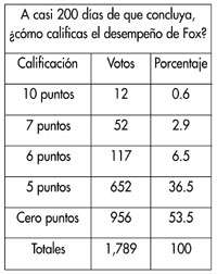 SOLO 12 DE mil 789 personas de toda la República cuya opinión sondeamos esta semana, califican con 10 el desempeño de Vicente Fox en la Presidencia. La semana próxima comenzará el conteo final: faltarán únicamente 200 días para que entregue la banda presidencial a su sucesor. Otras 52 personas le asignaron siete y 117, seis. Pero 652 lo calificaron con cinco puntos y el resto, 956, de plano le pusieron cero.