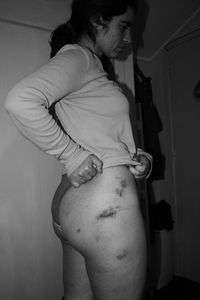 La estudiante chilena Valentina Larissa Palma Novoa muestra hematomas producidos por la golpiza que le propinaron policías en Atenco