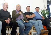 Francisco Martínez Marcué, Carlos Monsiváis, Antonio Helguera y Federico Arreola, durante la inauguración de la exposición