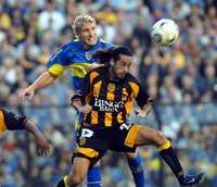 Martín Palermo (atrás), de Boca Juniors, y Juan Fernández, del Olimpo, durante su último juego de la campaña en Argentina