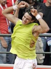 Júbilo del español Rafael Nadal luego del triunfo sobre el número uno del mundo, el suizo Roger Federer, en el Torneo de Maestros de Roma. El tenista ibérico podría batir el récord del argentino Guillermo Vilas el próximo lunes en Hamburgo