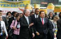 El alcalde de Londres, Ken Livingstone, y el presidente de Venezuela, Hugo Chávez, al salir ayer del City Hall, en una visita del mandatario sudamericano a la capital británica