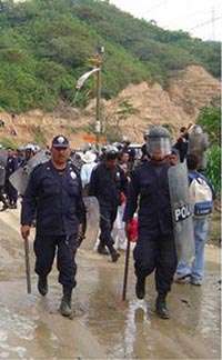 A las 12:30 horas, aproximadamente, 300 policías del estado arremetieron contra los inconformes, a quienes arrojaron gases lacrimógenos, informó Raúl Bennet, coordinador del proyecto humanitario Oxfam, de Gran Bretaña, quien realiza un estudio sobre las condiciones de la zona después de Stan.