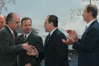 El presidente Vicente Fox, durante el anuncio de la transformación de la Refinería 18 de marzo en parque ecológico. Lo acompañan el director de Pemex, Luis Ramírez Corzo; el titular de la Semarnat, José Luis Juege Tamargo y el secretario de Energía, Fernando Canales