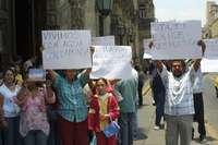 Guadalajara, Jal., 17 de mayo. Vecinos de la colonia Santa Fe, ubicada en el municipio conurbado de Tlajomulco de Zúñiga, protestaron frente al palacio de gobierno para exigir a las autoridades estatales respaldo ante el fraude del que los hizo víctimas la constructora Homex. Los colonos demandaron penalmente a la empresa para que responda por las deficiencias en la edificación de las 17 mil viviendas del fraccionamiento.