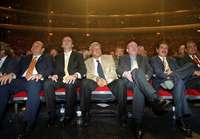 El dirigente nacional del PRD, Leonel Cota Montaño, junto a Andrés Manuel López Obrador (al centro), durante la rendición de protesta de candidatos priístas a diputados y senadores, el pasado 26 de abril en el Auditorio Nacional