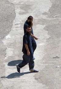 Militares trasladan en Guantánamo a un prisionero islámico a una sesión de interrogatorio. A la derecha, dos de los cinco chinos musulmanes de la confesión Uighur, liberados en la base naval estadunidense la semana pasada, pasean en el Centro Nacional para Refugiados de Tirana, Albania