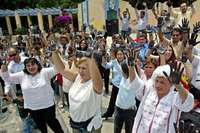 Convocados por Jesusa Rodríguez (quien aparece en primer plano, a la derecha), numerosos ciudadanos se pintaron las manos de negro para protestar contra la campaña "de mentiras y odio" del candidato presidencial panista, Felipe Calderón Hinojosa