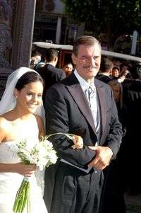 El presidente Vicente Fox llega a la catedral de León con su hija Paulina, quien contrajo matrimonio este sábado. La recepción se efectuó en el rancho San Cristóbal