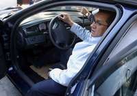 Joel Ortega, secretario de Seguridad Pública del Distrito Federal, prueba una de las nuevas patrullas, ayer, durante la entrega de uniformes nuevos a elementos de la SSP