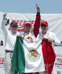 Bourdais y sus compañeros de equipo festejan con la bandera mexicana