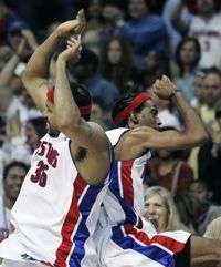 Rasheed Wallace (izquierda) y Richard Hamilton, de los Pistons de Detroit, festejan en los últimos segundos el triunfo sobre Cavaliers de Cleveland, y se preparan para enfrentar a Miami