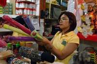 Hua Si Su, que se afincó en la ciudad de México proveniente de la ciudad china de Kaiping hace poco más de un año, muestra sombrillas de papel a clientes de su negocio en el Barrio Chino del Distrito Federal