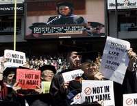 Con carteles de "No en mi nombre", alumnos y profesores del Boston College de Massachusetts rechazaron ayer la presencia en la ceremonia de fin de cursos de la secretaria de Estado estadunidense, Condoleezza Rice