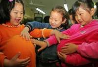 Transfusiones sanguíneas y hospitalización posparto de varios días son algunos de los problemas que se presentan después de una cesárea, señala el reporte de la investigación de la OMS. En la imagen: niñas de kínder simulan estar embarazadas, durante una celebración del día de las madres en la provincia de Anhui, en China