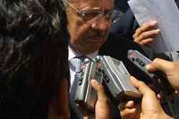 El procurador del estado de México, Abel Villicaña, quien calificó de ''mala racha'' la ola de violencia en Nezahualcóyotil y Chimalhuacán. A la derecha, dos funcionarios muestran el anuncio con el que se ofrecerá una recompensa a quien proporcione información sobre los asesinatos de mujeres en la entidad