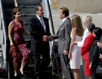 El presidente Vicente Fox al ser recibido ayer por el gobernador de California, Arnold Schwarzenegger, en el aeropuerto de Sacramento