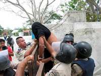 Policías de Cancún someten a uno de los colonos que bloqueaban la carretera en la zona conurbada de Benito Juárez e Isla Mujeres, el jueves pasado