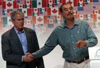 Ampliar la imagen Los presidentes George Bush y Vicente Fox tras la conferencia de prensa que ofrecieron sobre los resultados de la reunión de la Alianza para la Seguridad y Prosperidad de América del Norte, en Cancún, Quintana Roo, el 31 de marzo pasado Foto: José Carlo González